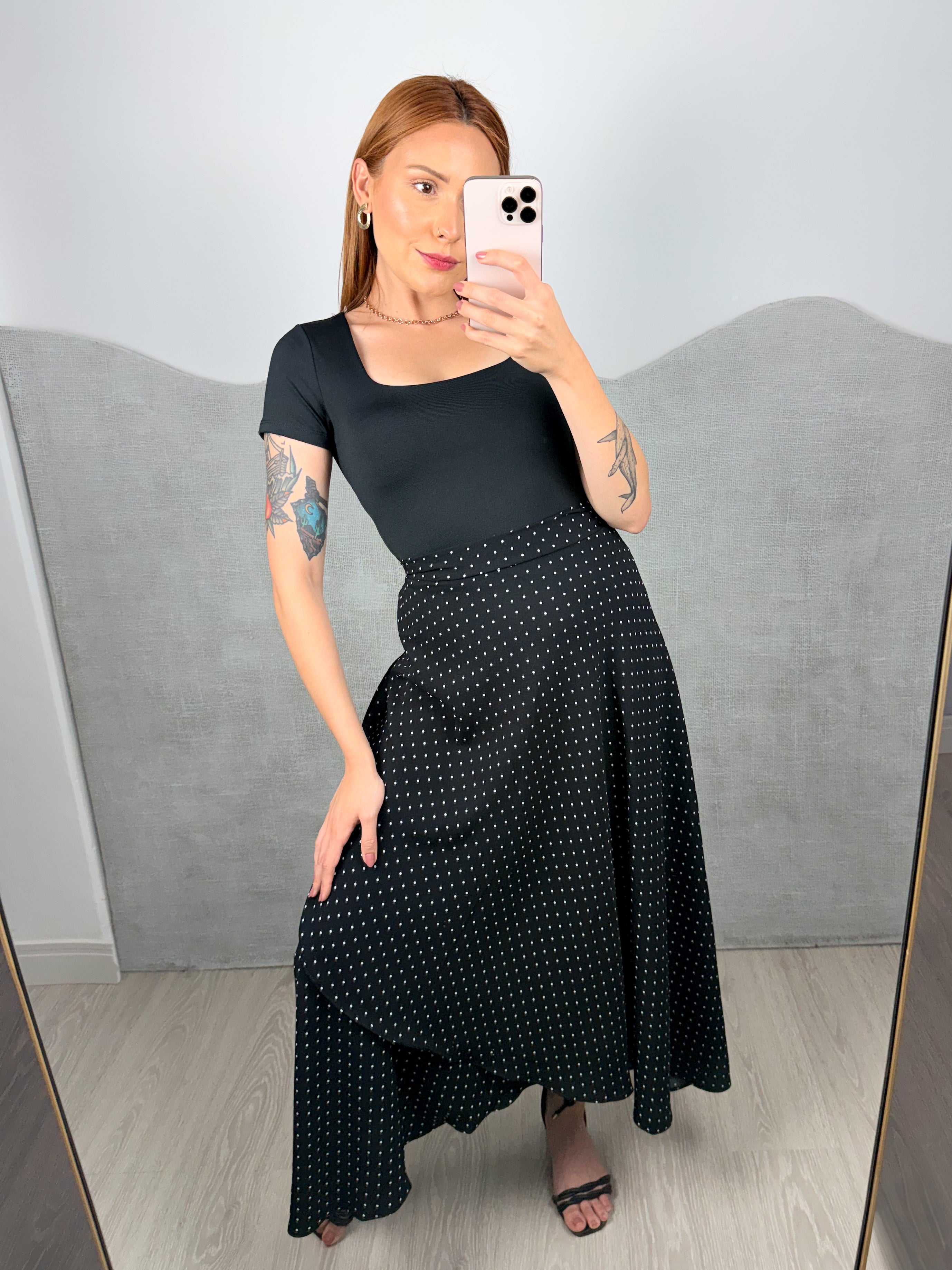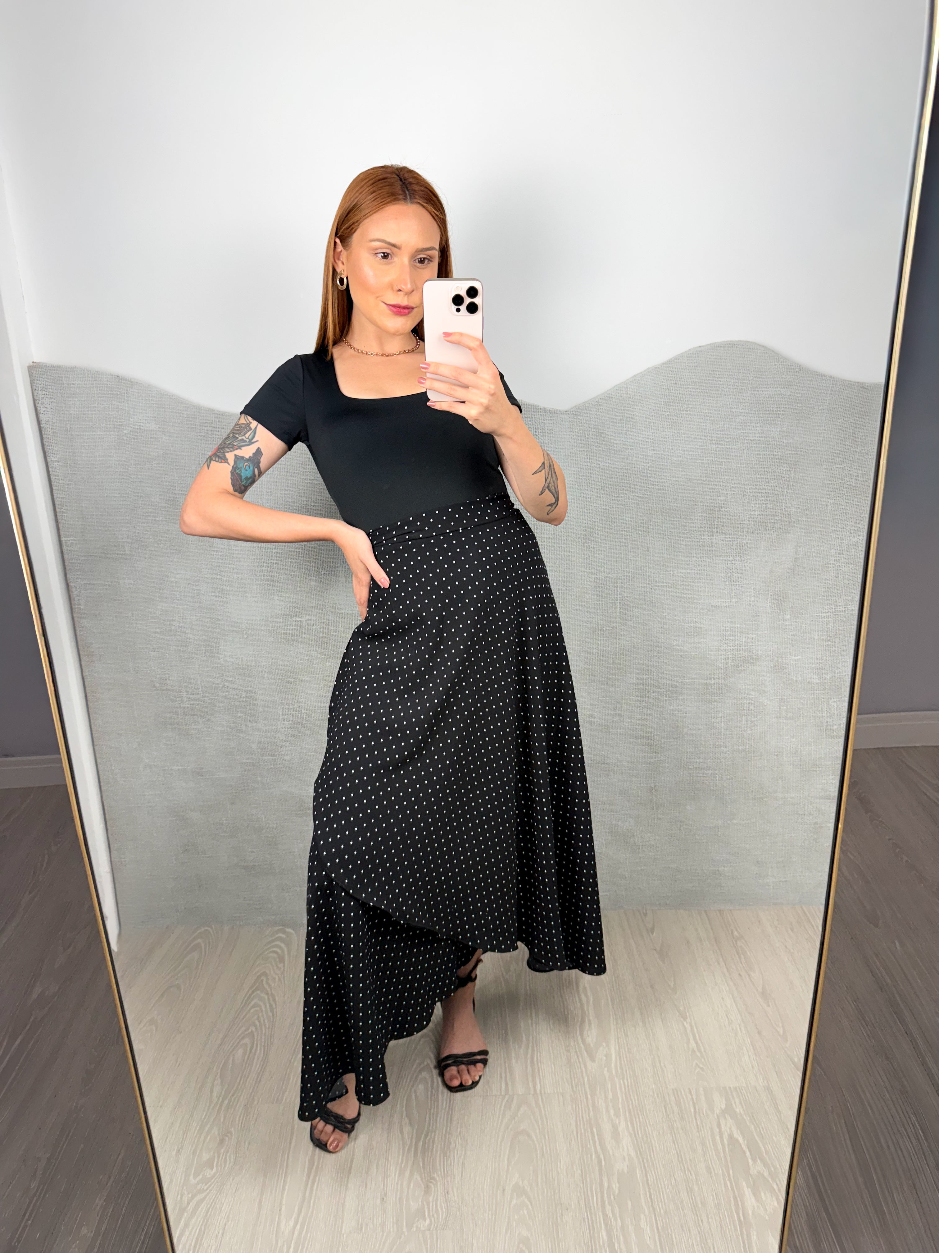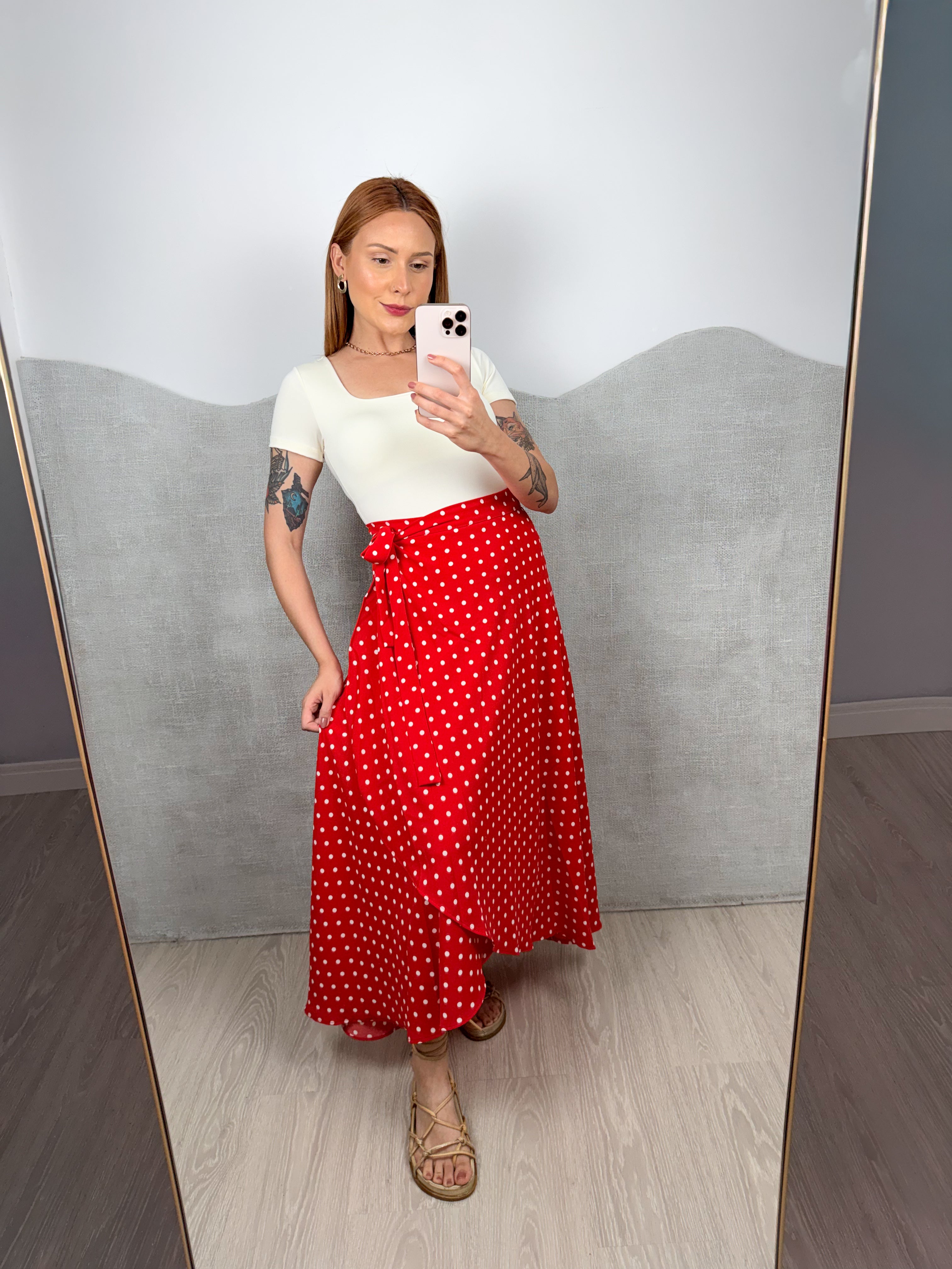 A Saia Envelope é aquela peça que valoriza a silhueta com elegância e movimento. Seu corte transpassado cria um caimento fluido e feminino, ideal para combinar com blusas mais justas ou croppeds. O tecido leve e o toque macio garantem conforto em qualquer ocasião — do look casual ao mais sofisticado.
