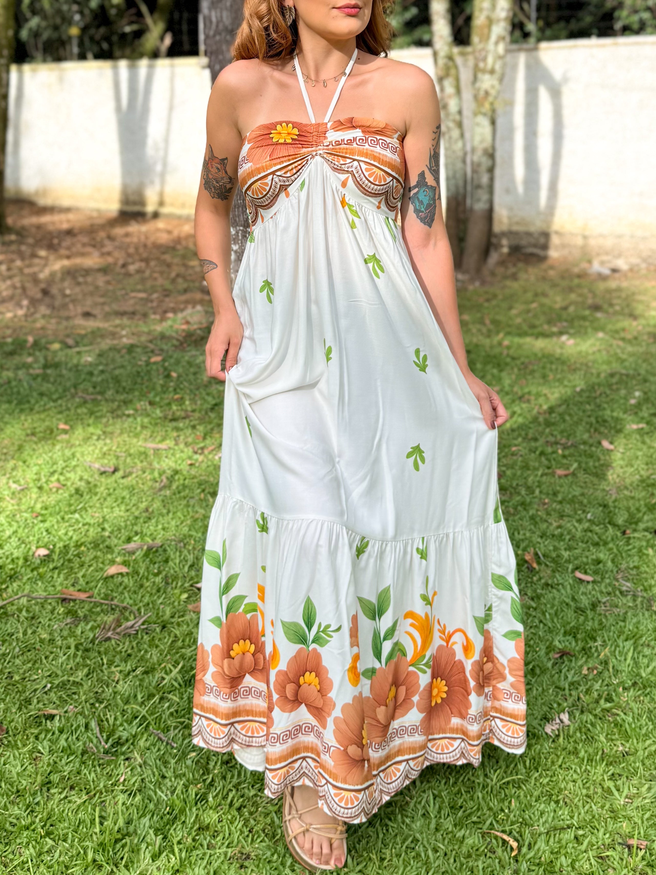 Vestido Estampado Longo Amarração Pescoço Gabi